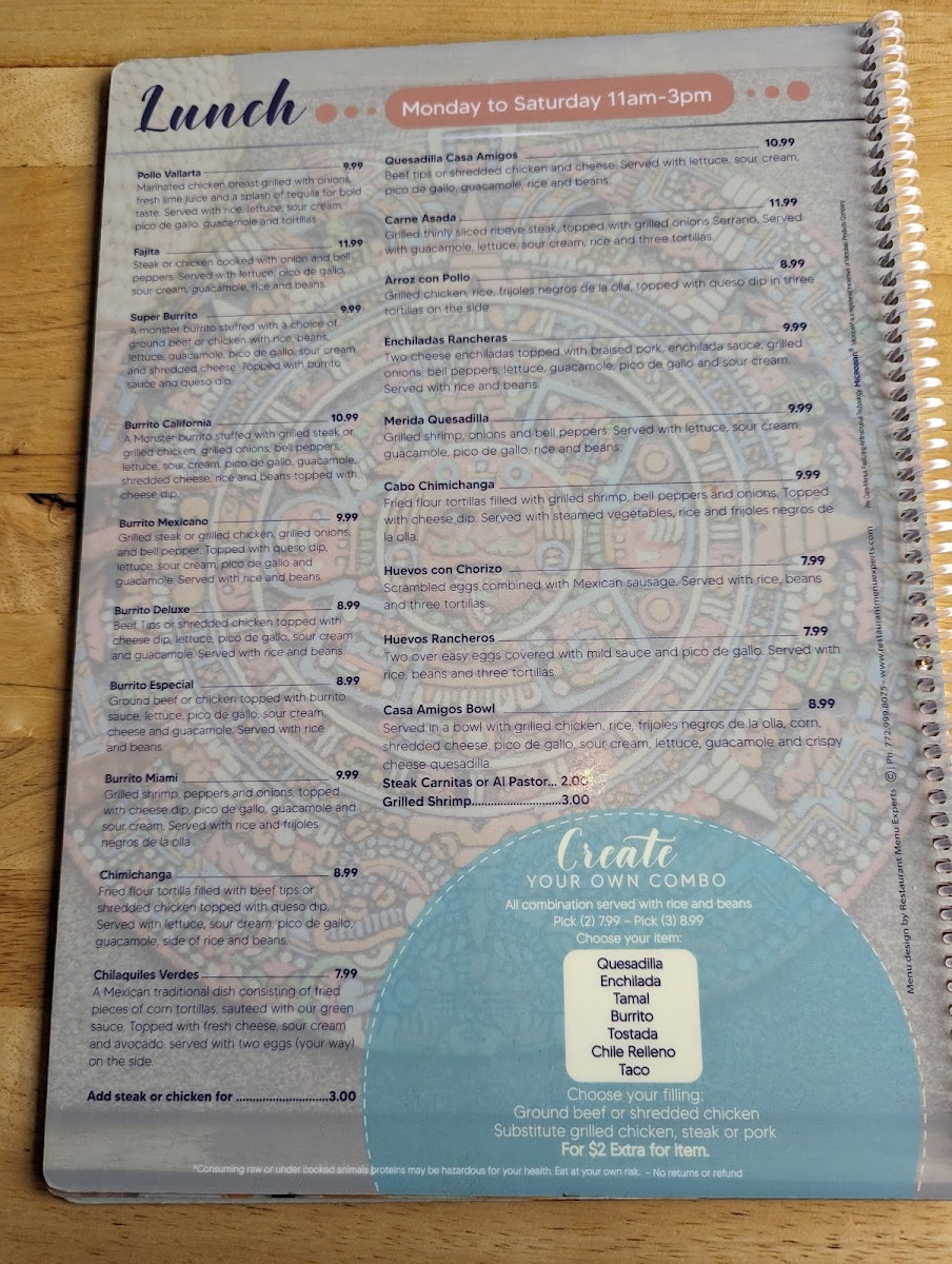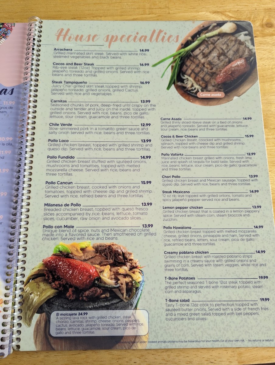 Serves two. Choice of steak, chicken, roast pork, combinations of steak and carnitas, steak and chicken, or trio of steak, chicken, and shrimp. Sizzling fajitas.