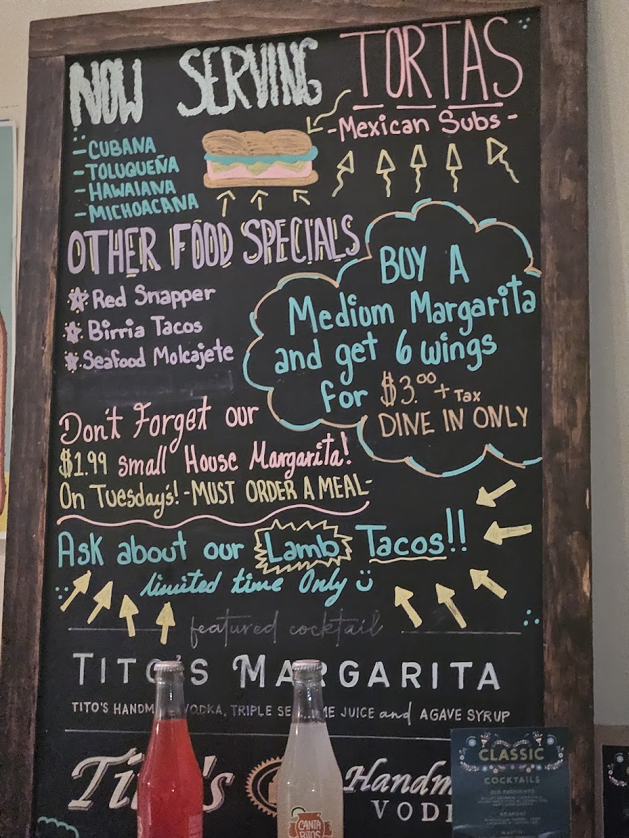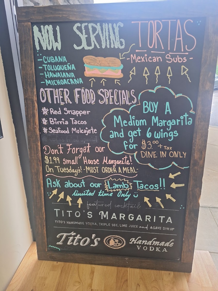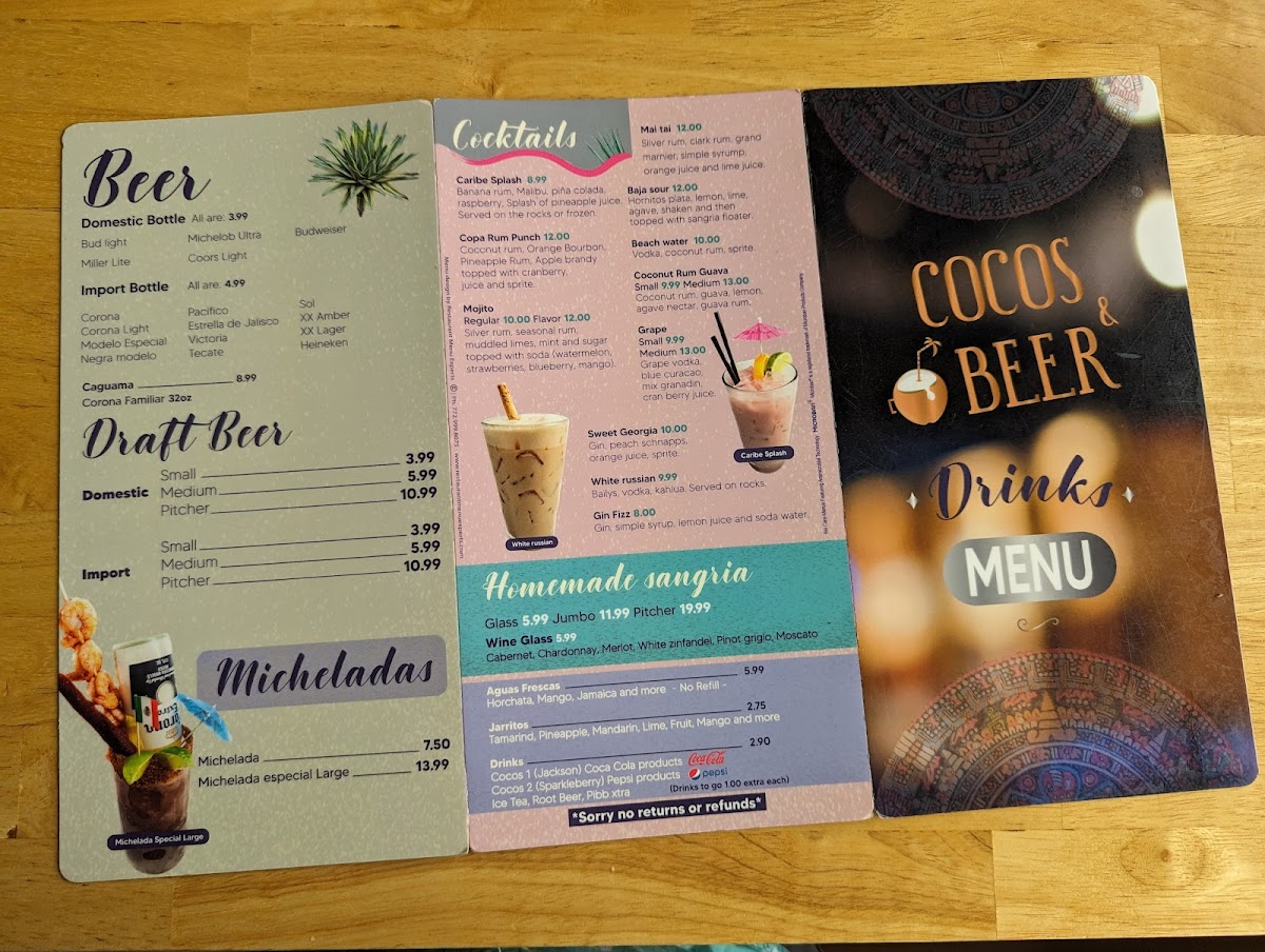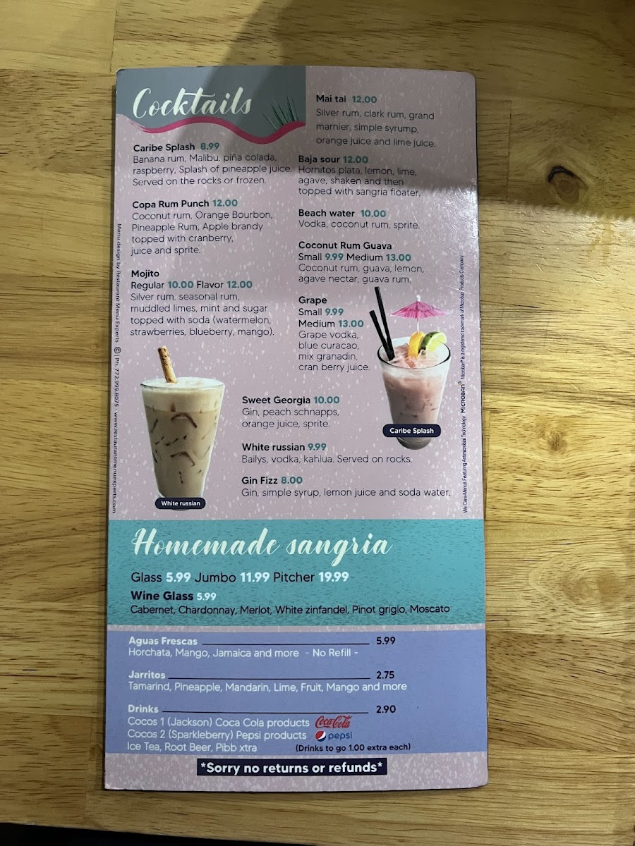 Four rolled tortillas, beef tips or shredded chicken flash-fried. Topped with lettuce, sour cream, Pico de Gallo and queso fresco.